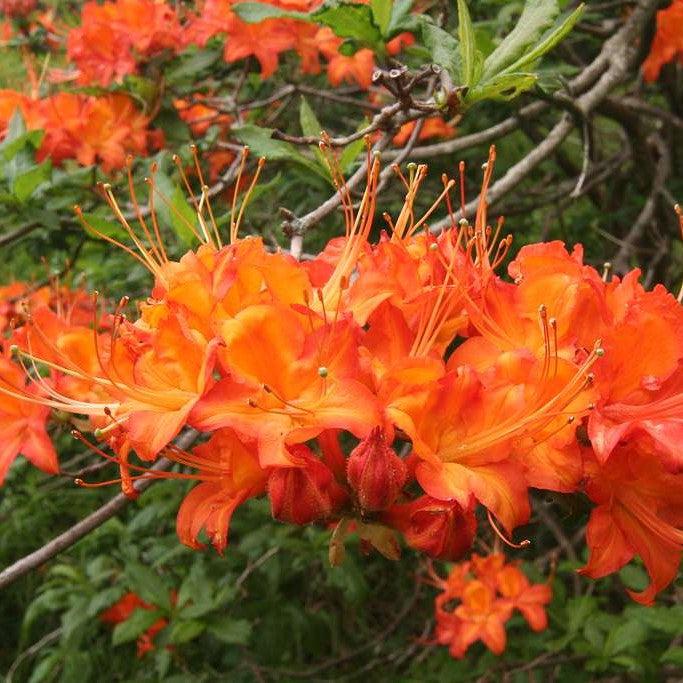 Frontier Gold Native Azalea is an Aromi hybrid and native deciduous shrub with an upright habit.  Orange red buds open to spicy fragrant orange flowers with gold highlights and ruffled edges in early spring.  Best grown in part sun and rich, moist, acidic well-drained soils.  Aromi hybrids are heat and humidity tolerant.