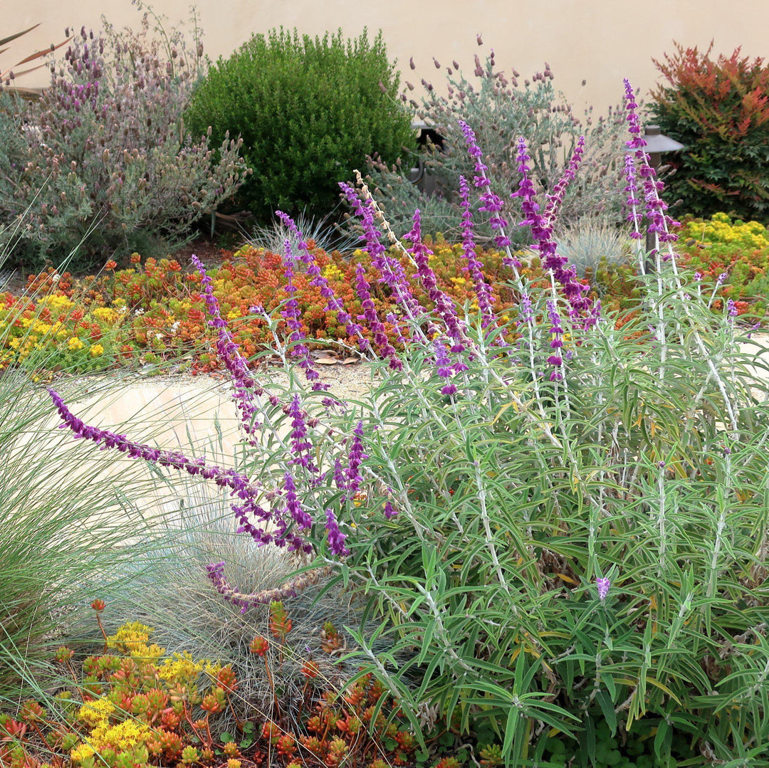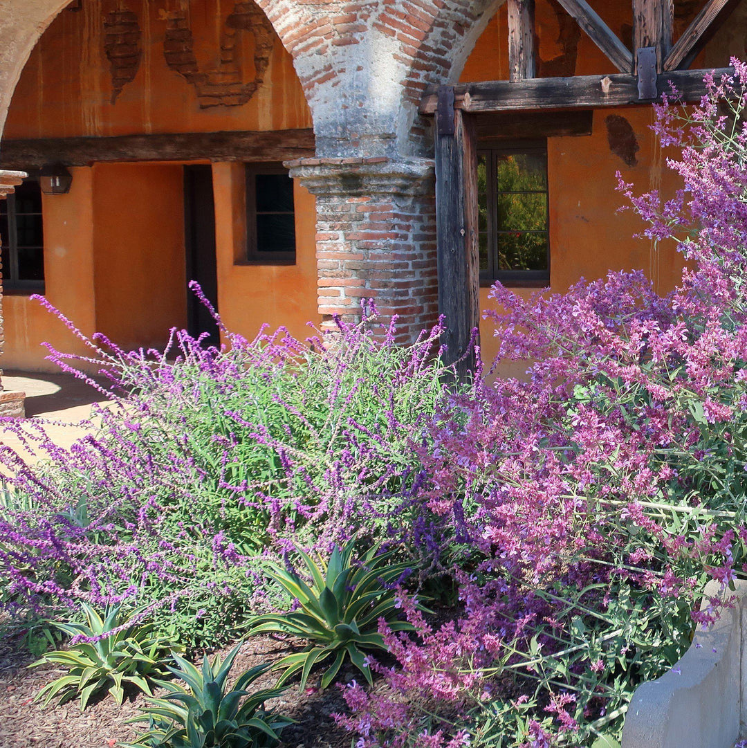 IMAGES: Photoset by cultivar413, (1) 190609 170 Historic Mission San Juan Capistrano - Central Courtyard, East Wing, (2) 180512 059 Mission Hills Garden Walk, (3) Michael Rivera, Coastal Georgia Botanical Gardens, Dwarf Mexican Bush Sage Salvia leucantha 'Santa Barbara', CC BY-SA 4.0