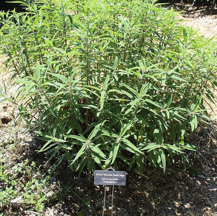 Santa Barbara Mexican Bush Sage is a shrubby evergreen herbaceous perennial with velvety grey-green foliage. Arching terminal spikes with showy velvety purple flowers bloom throughout summer and until the first frost attracting butterflies and hummingbirds. Flowers best in full sun and moist well-drained soils.