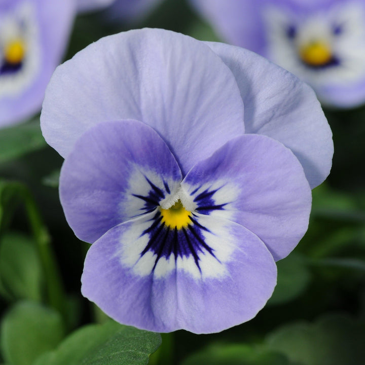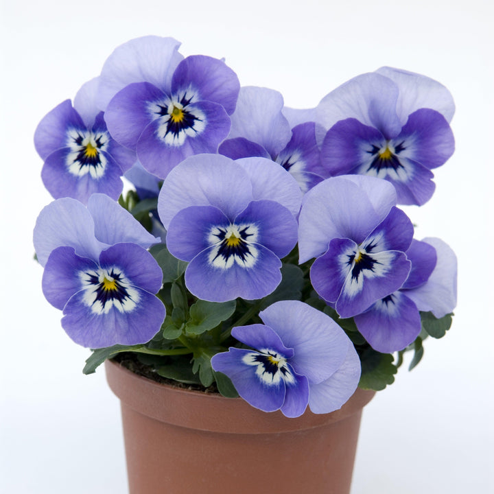 Sorbet XP Marina Viola is a hardy compact uniform perennial with tight branches and toothed green heart-shaped leaves leaves. The fragrant, large light blue flowers with a deep violet center surrounded by a white halo bloom freely from fall through spring in mild winters if deadheaded. Prefers full sun and moist well-drained soils. The Sorbet of XP series has larger flowers with a more consistent and uniform form.